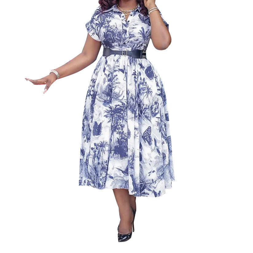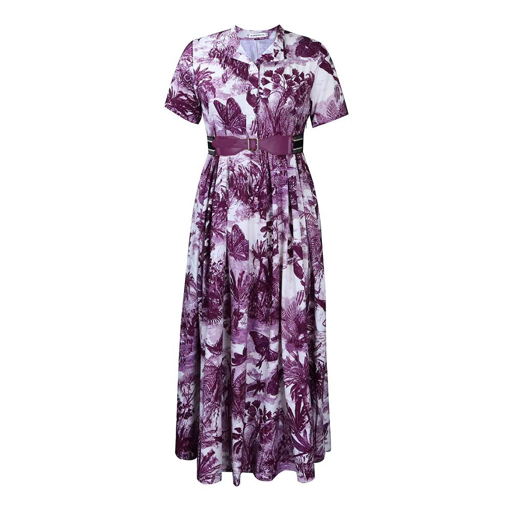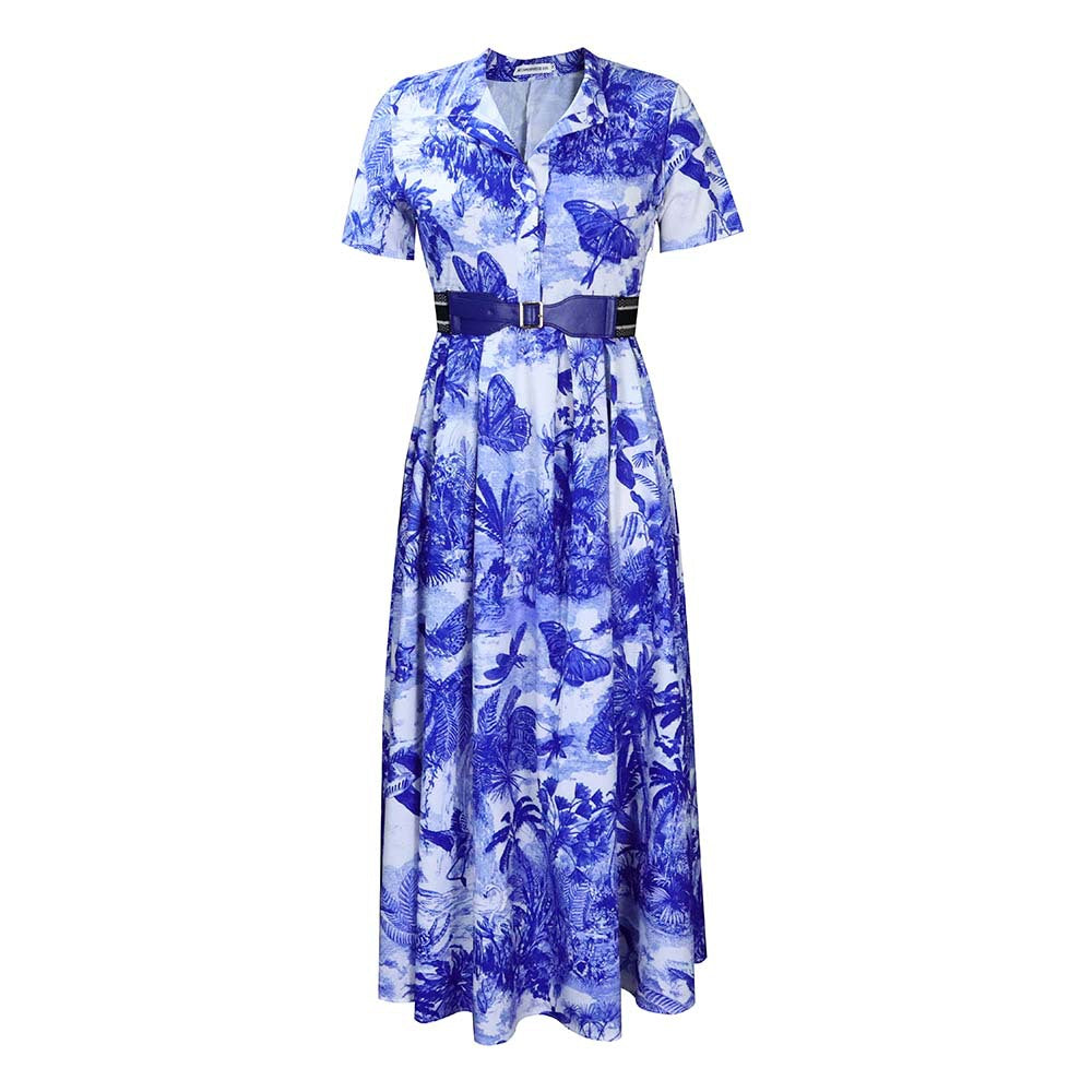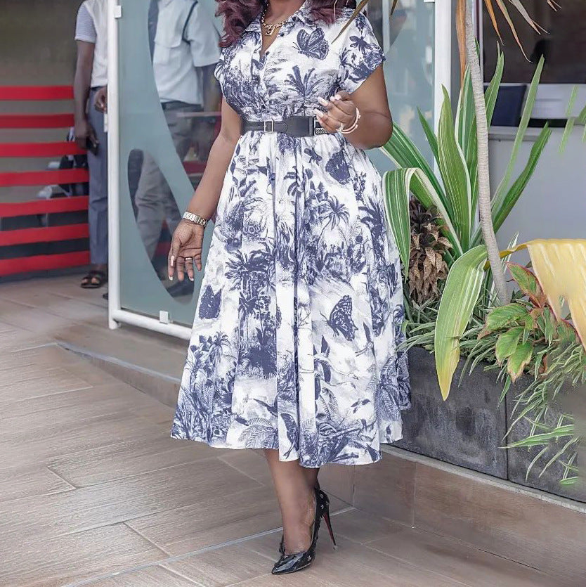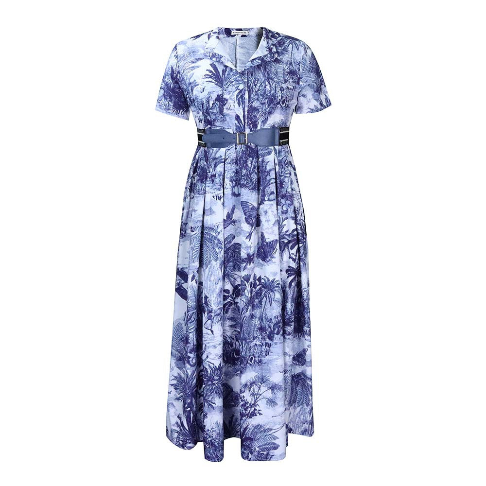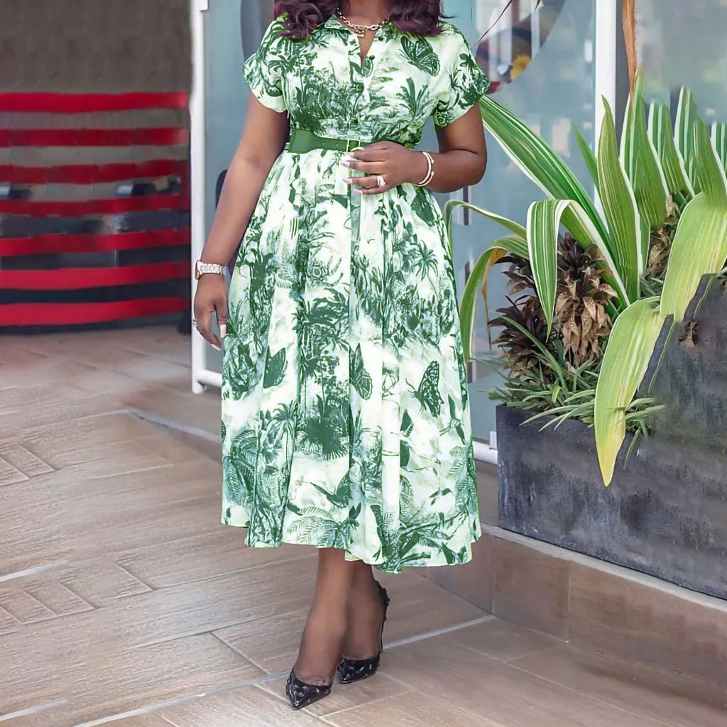 女子植物圖案A-Line連衣裙,帶領和短袖