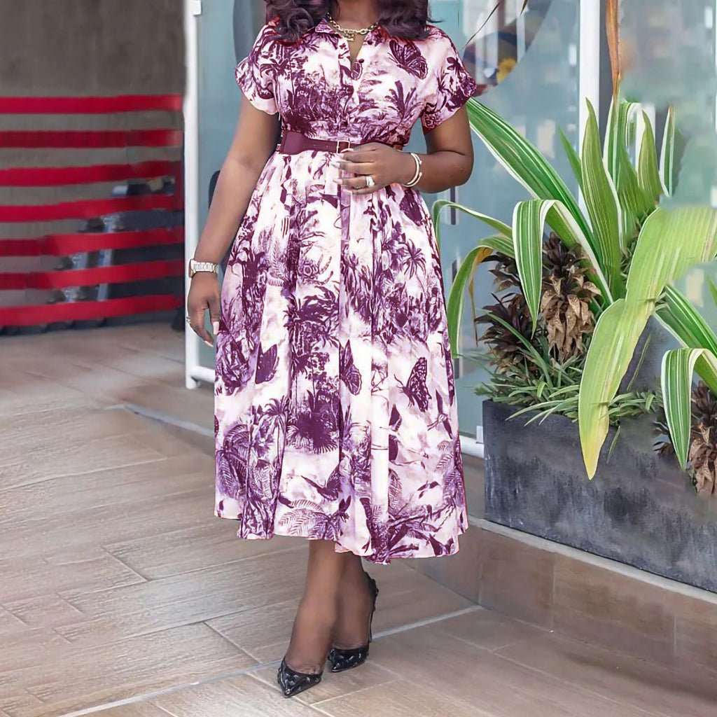 將熱帶地區的共鳴帶到您的合奏中,穿著女性的植物圖案A-Line連衣裙,帶有衣領和短袖。這件衣服是您選擇的顏色,包括各種藍色,紫色和綠色的陰影。
