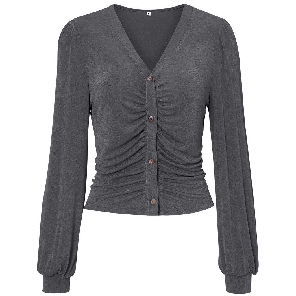 在今年秋天,穿著女士的長袖鈕扣戴上襯衫的女性搭配面料,看起來很可愛,並感覺可愛,可以窺視肚臍。它有三種顏色之一。
