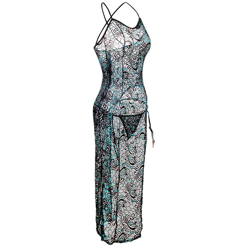讓您的身材傾斜,然後窺視一下在鱗片蕾絲半腿內衣禮服下等待的東西,一側裸露的臀部和腿。