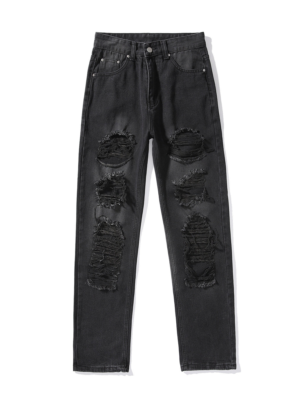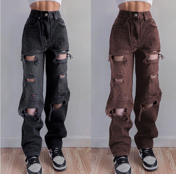 在這些女子高腰部寬鬆的牛仔褲上脫穎而出的牛仔褲,上面有撕裂和眼淚。從大腿到脛骨都是大裂口和破舊的牛仔布,使它們彈出。