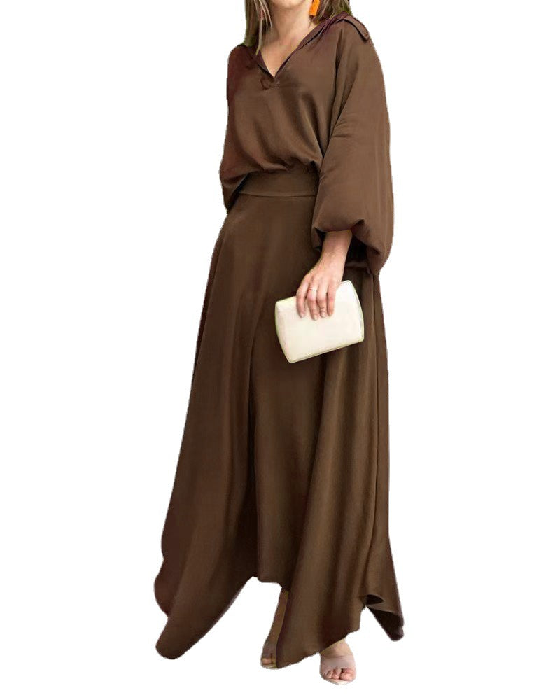 穿著女士長鐘袖V領連衣裙脫穎而出。這款寬鬆的連衣裙設有一個束縛的中心,使其形狀有些塑造。它以中性色調。