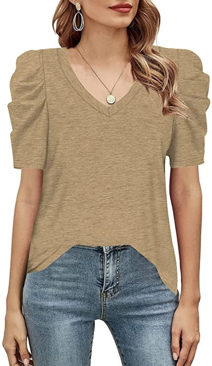 給您的休閒衣櫃一個穿著女子蓬鬆的袖子V領短袖T恤的更新。該T卹以其獨特的袖子引起人們的注意,並有多種顏色供您選擇。