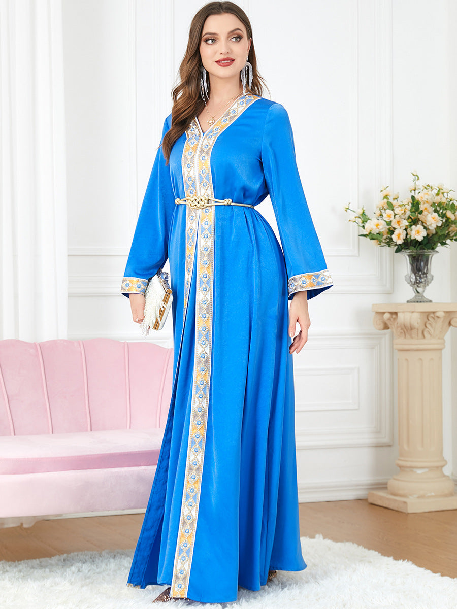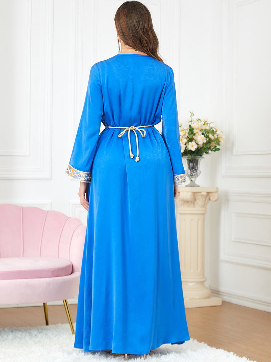 The Women's Long Sleeve Cream White Maxi Dress features subtle details of gold, blue and gray, creating a simple yet stylish color scheme.