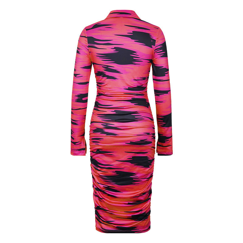 Express your vibrant personality with the Women's Long Sleeve Form Fitting Midi Dress. This vividly colored dress features hot pink, orange and red accented by black and purple.